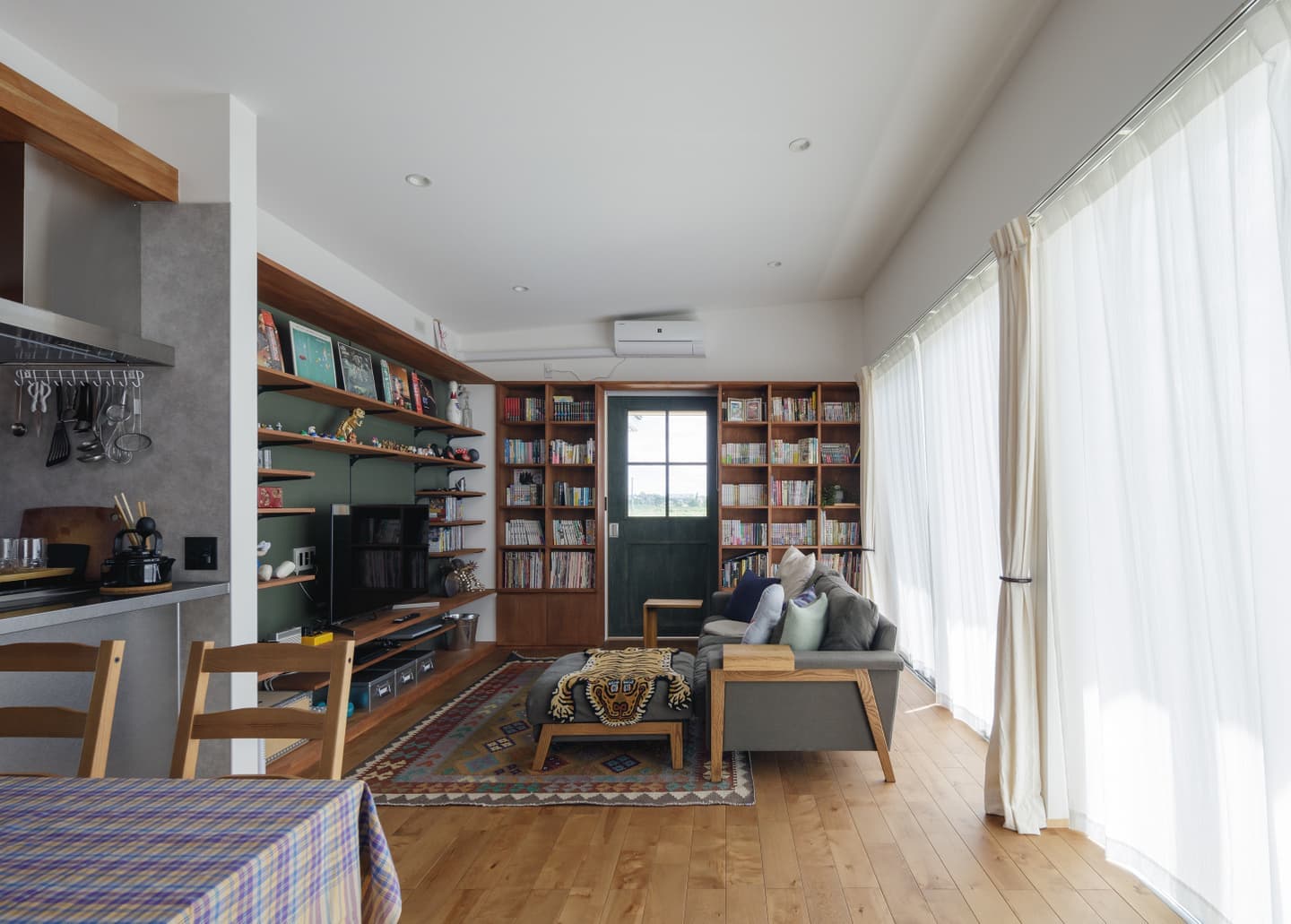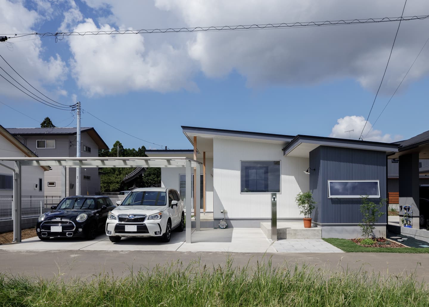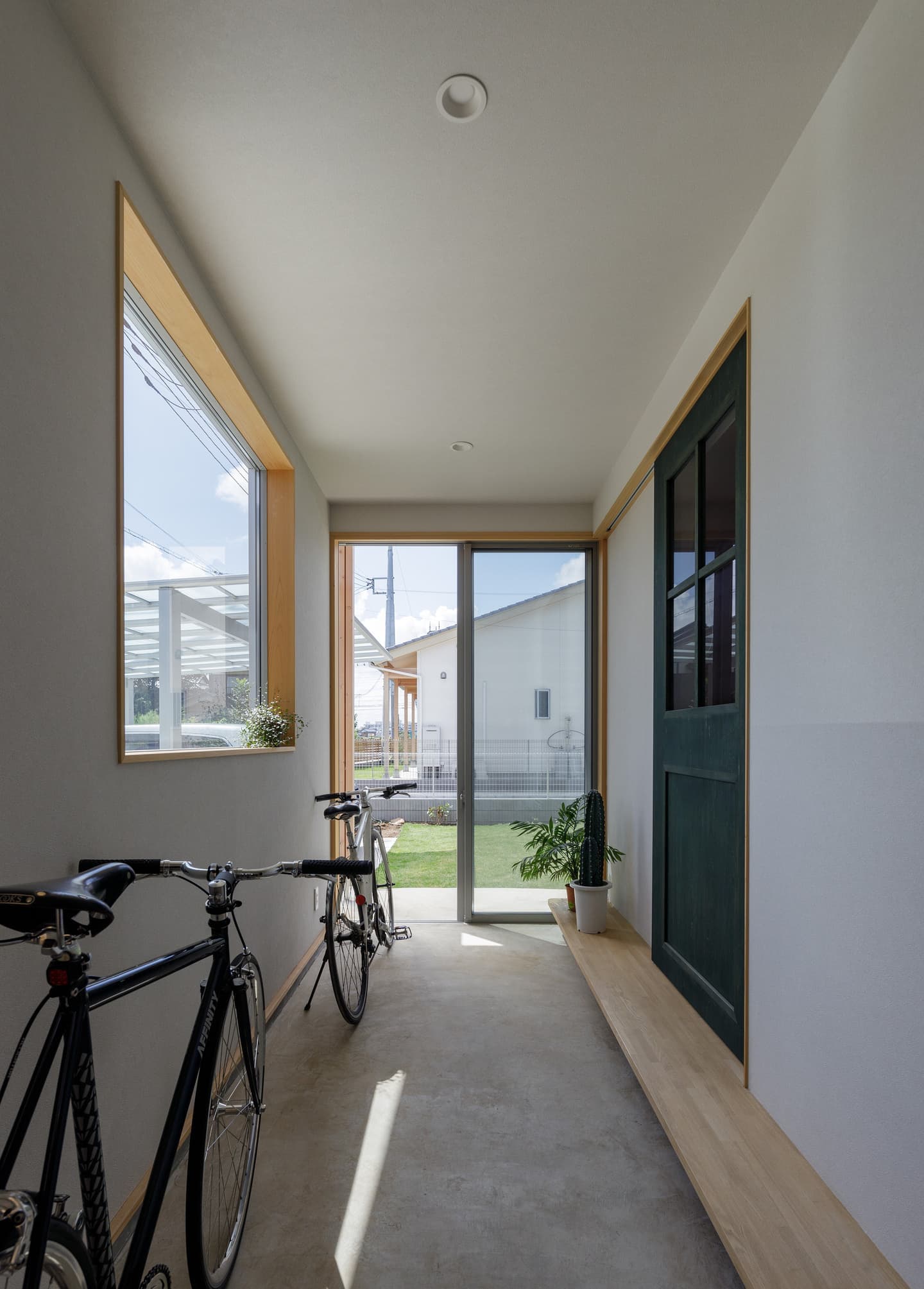 | つくば中心部にほど近い市街化調整区域に計画された住宅。 生活利便性を享受しながら、周囲には芝生の畑が広がり、遠景には筑波山や宝篋山を望む、自然に恵まれたロケーションに建っています。 建物は南向きにL字型に配置し、各室に南面採光を確保。明るく心地よい住空間を実現しています。 玄関を入ると広がる土間のホールは、外と内の境界を緩やかにつなぎ、季節や気配を感じられる柔らかな導入空間となっています。 玄関脇には離れのように独立した書斎を設け、窓越しに筑波山を望む特等席として、趣味や仕事に集中できる特別な場所としています。 LDKを中心に回遊性をもたせた2つの動線計画も本住宅の特徴です。ひとつはキッチンから水回り、主寝室、洋室を経て再びリビングへと戻る動線、もうひとつはシューズクロークから土間を通じてリビングへと至るルートで、機能性と風通しを両立しています。 主寝室側の動線の中核にはファミリークローゼットを配置し、収納を共有することで、各室のスペース効率を高めています。 |
