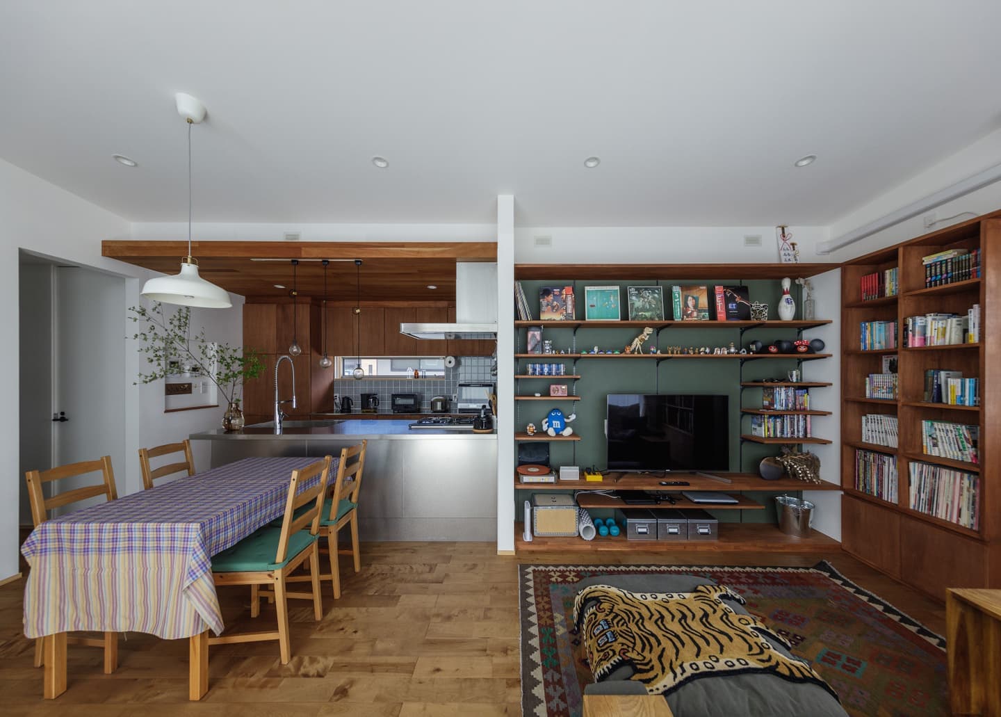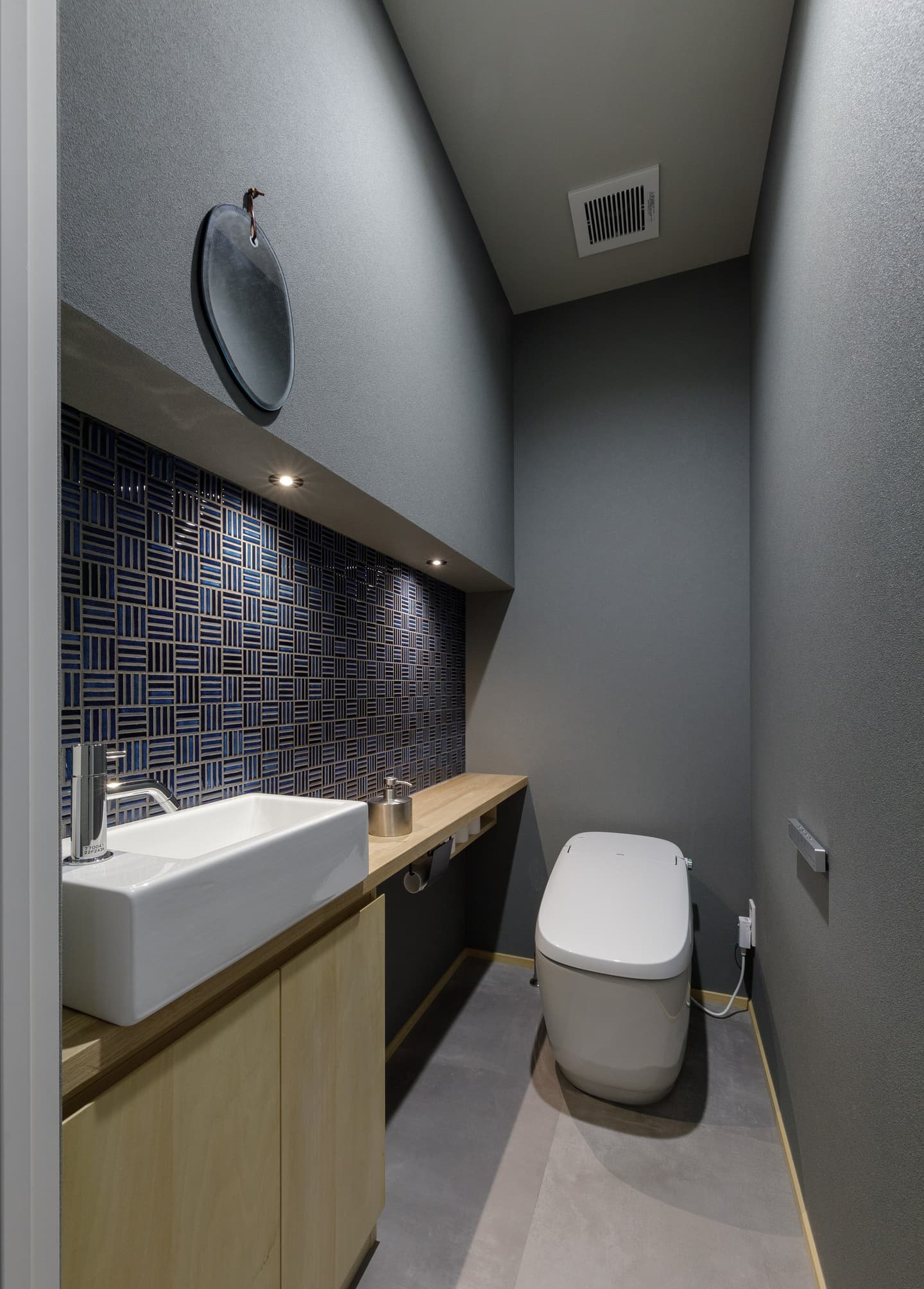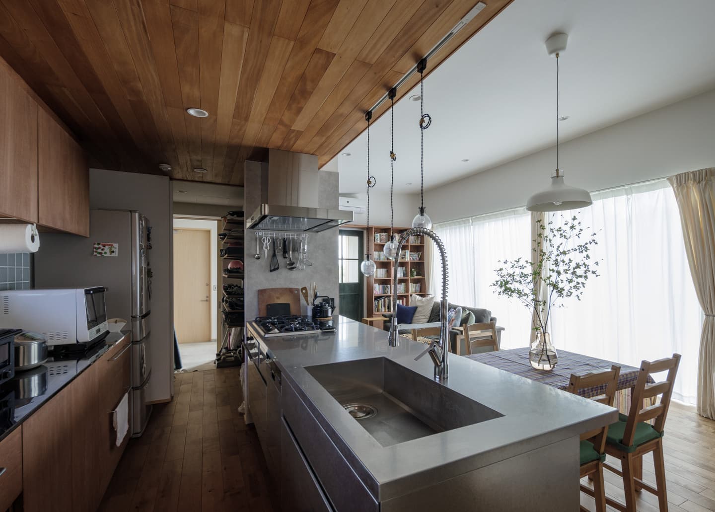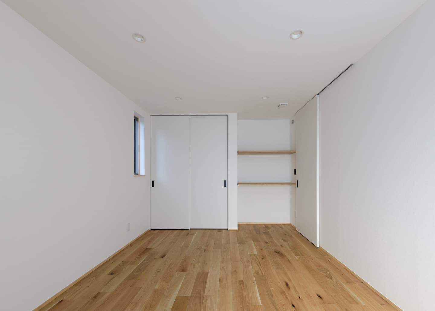 | つくば中心部にほど近い市街化調整区域に計画された住宅。 生活利便性を享受しながら、周囲には芝生の畑が広がり、遠景には筑波山や宝篋山を望む、自然に恵まれたロケーションに建っています。 建物は南向きにL字型に配置し、各室に南面採光を確保。明るく心地よい住空間を実現しています。 玄関を入ると広がる土間のホールは、外と内の境界を緩やかにつなぎ、季節や気配を感じられる柔らかな導入空間となっています。 玄関脇には離れのように独立した書斎を設け、窓越しに筑波山を望む特等席として、趣味や仕事に集中できる特別な場所としています。 LDKを中心に回遊性をもたせた2つの動線計画も本住宅の特徴です。ひとつはキッチンから水回り、主寝室、洋室を経て再びリビングへと戻る動線、もうひとつはシューズクロークから土間を通じてリビングへと至るルートで、機能性と風通しを両立しています。 主寝室側の動線の中核にはファミリークローゼットを配置し、収納を共有することで、各室のスペース効率を高めています。 |