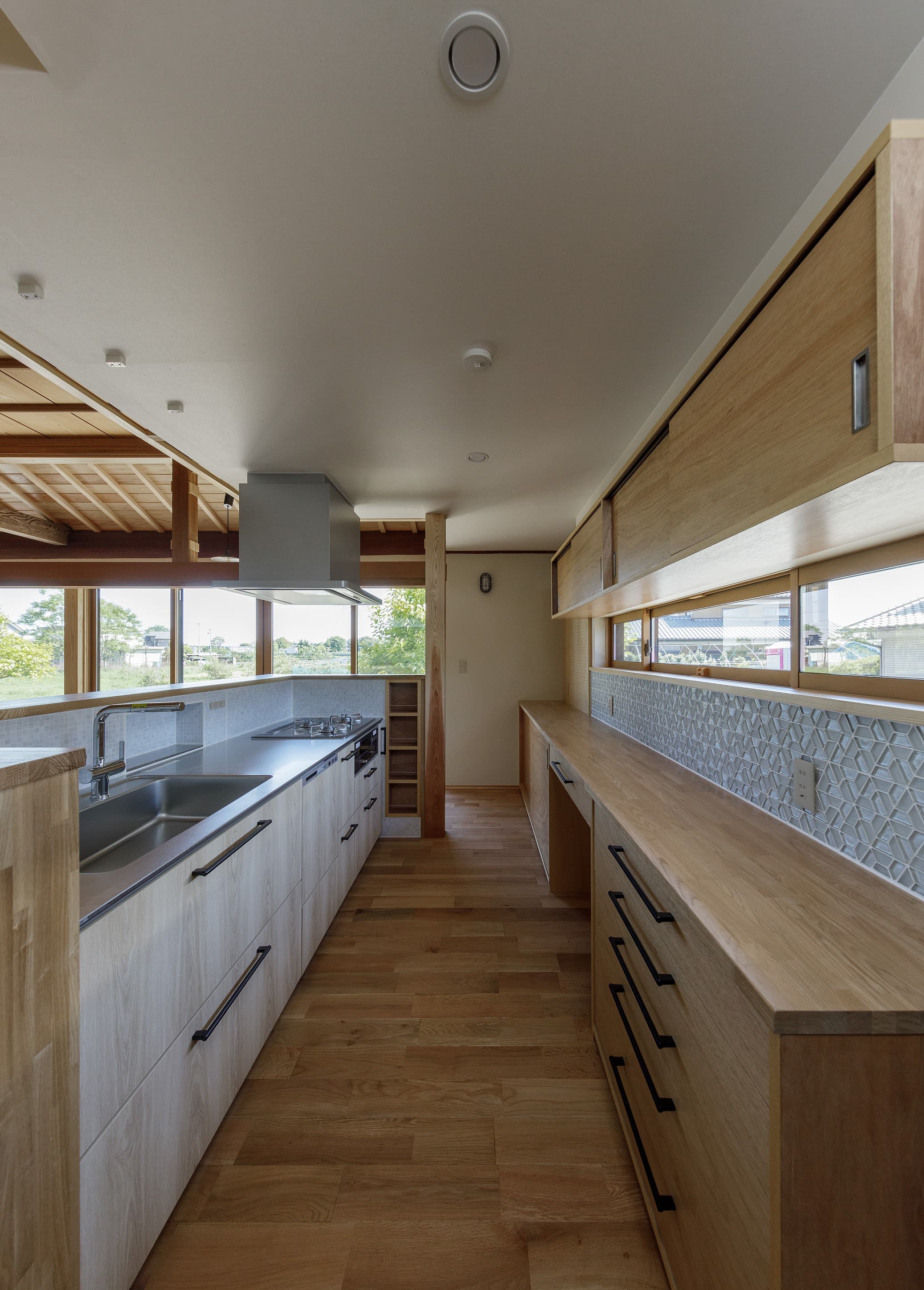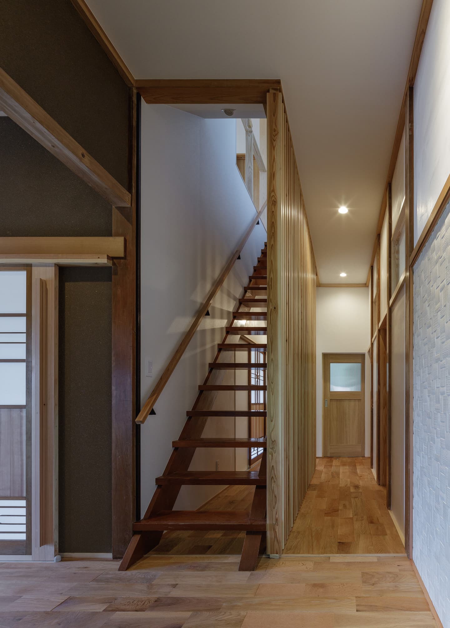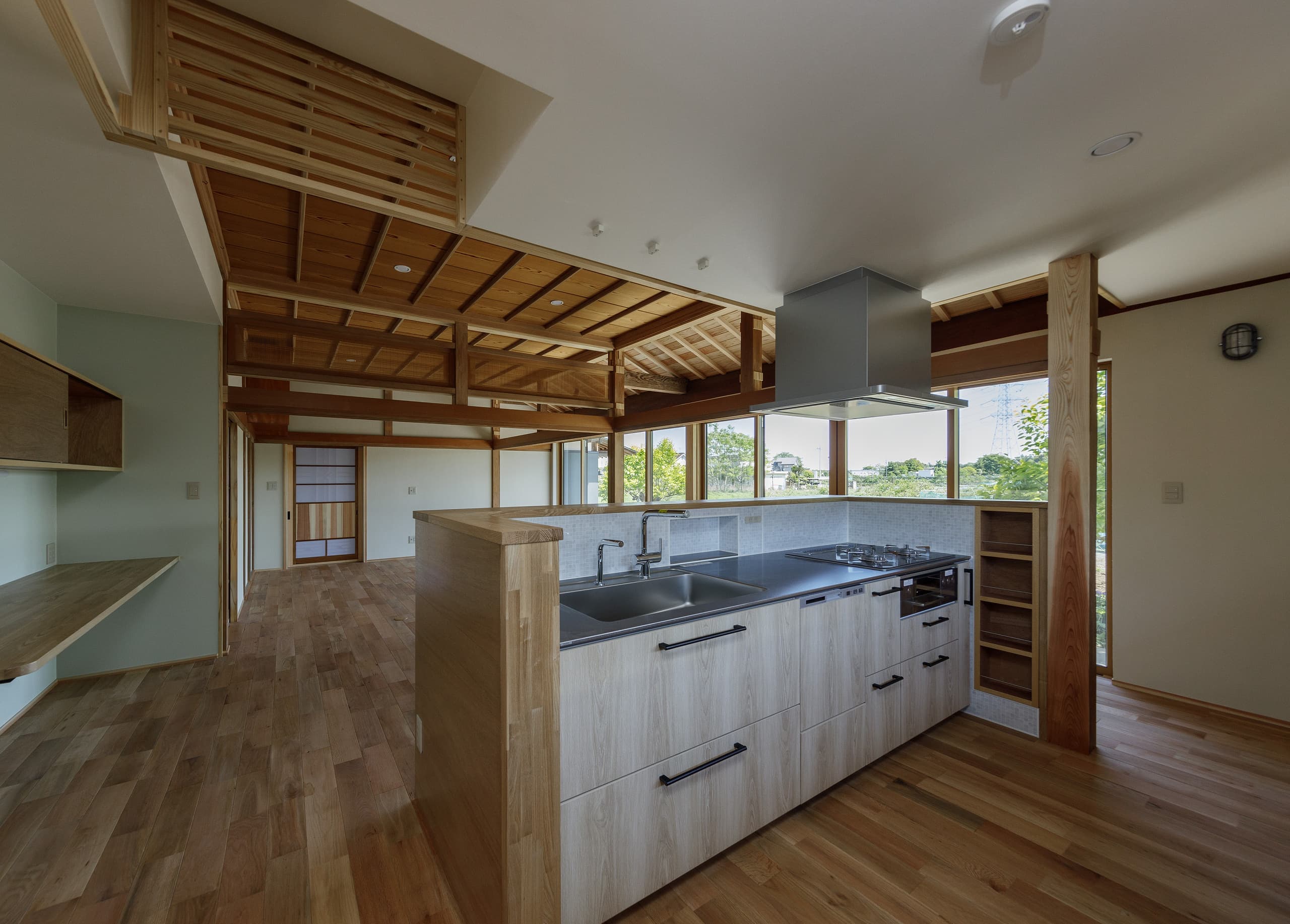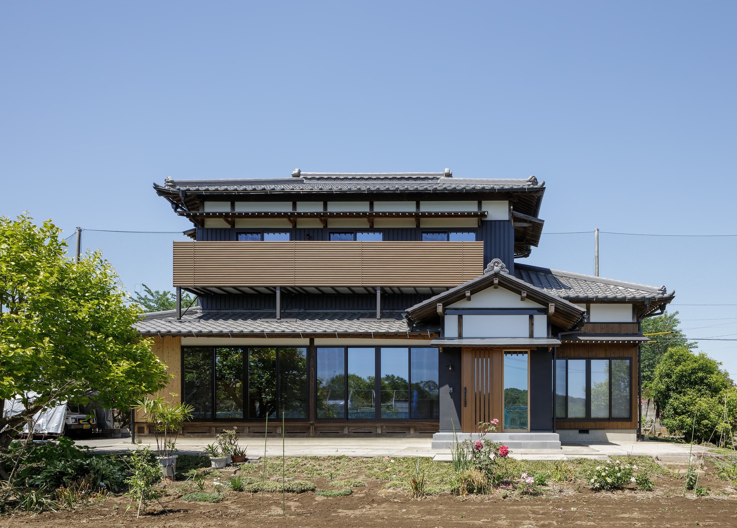 | 築34年、多くの思い出が刻まれた住まいを、フルリノベーションによって新たな暮らしのかたちへと再生しました。 この住まいの象徴である入母屋の瓦屋根を残し、その他の部分はほぼスケルトン状態に。構造の安定を図るため、既存の柱の位置は可能な限りそのまま活かしながら、お施主様のご要望に寄り添った新たな間取りを構築しています。床・壁・天井の断熱強化、構造補強、開口部の断熱性能向上により、快適性も大きく向上しました。 日当たりの良い南側にあった8帖の和室2間続きは、開放的なLDKに再構成。北側にあった和室はキッチンと繋がるバックヤードとし、LDを通らず水回りへアクセスできる裏動線を確保しています。玄関右手のかつての応接室は、来客対応も可能な和室に。奥の台所は、明るく快適な洋室へと生まれ変わりました。 階段は既存のものを再利用し、ルーバーで囲むデザインとすることで空間にやわらかな仕切りを生み出しています。階段を上がった先にあった洋室は、この年代の住宅に多く見られる小屋裏の丸梁をあえて現し、多目的に使用できるホールに。主寝室にはタタミ敷きの小上がりを設け、落ち着いたくつろぎの空間としました。 竿縁天井や襖間、付書院、神棚、建具など、建物が長い年月をかけて纏ってきた風合いある意匠を丁寧に再利用。現代の暮らしに合った設備やインテリアを組み合わせることで、時を超えて愛着をつなぐ、心地よい住まいへと生まれ変わりました。 築34年の沢山の思い出の詰まったお住まいをフルリノベーションしました。 この建物の特徴である入母屋の瓦屋根以外は、ほぼスケルトンの状態にした上で、構造を安定させるため既存の柱の位置は出来るだけ変更せず、その中でお施主様のご要望を盛り込んで部屋をレイアウトし直しています。床と壁と天井の断熱の補強、構造筋交い等の補修補強、窓の性能UPを行い、温熱環境も向上しています。 和室8帖の続き間のあった日当たりの良い南側はLDKに。和室があった北側部分をバックヤードとしてキッチンと繋げ、LDを通らず水回りを経由する裏動線を確保しています。玄関から入って右側の応接室部分を客間としても使える和室へ。その奥の台所部分は洋室に生まれ変わりました。 階段は既存を再利用しルーバーで囲むデザインとし、階段を登り切った部分にあった洋室は、この年代の建物の特徴でもある小屋裏に隈れていた丸梁を天井から露出させ多目的に使えるホールとしています。また主寝室はゆっくりと寛げるタタミ敷きの小上がりとしました。 時間の経過とともに深まった建物の持つ風合いを出来るだけ生かせるデザインを考え、竿縁天井や襴間、付書院や神棚、建貝などを趣のある材料を再利用しながら、現代の暮らしに適した間取りと設備やインテリアとする事で、愛着を残しながらも快適に過ごせるリノベーションとなりました。 |