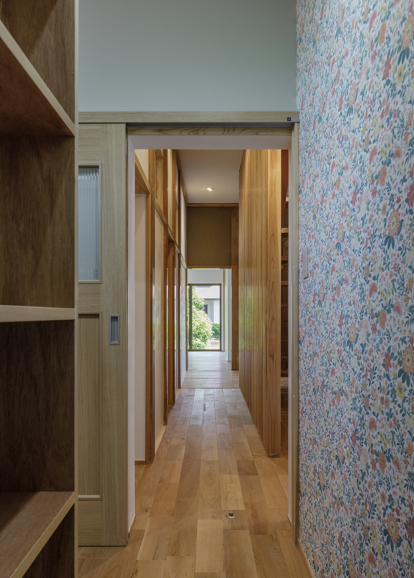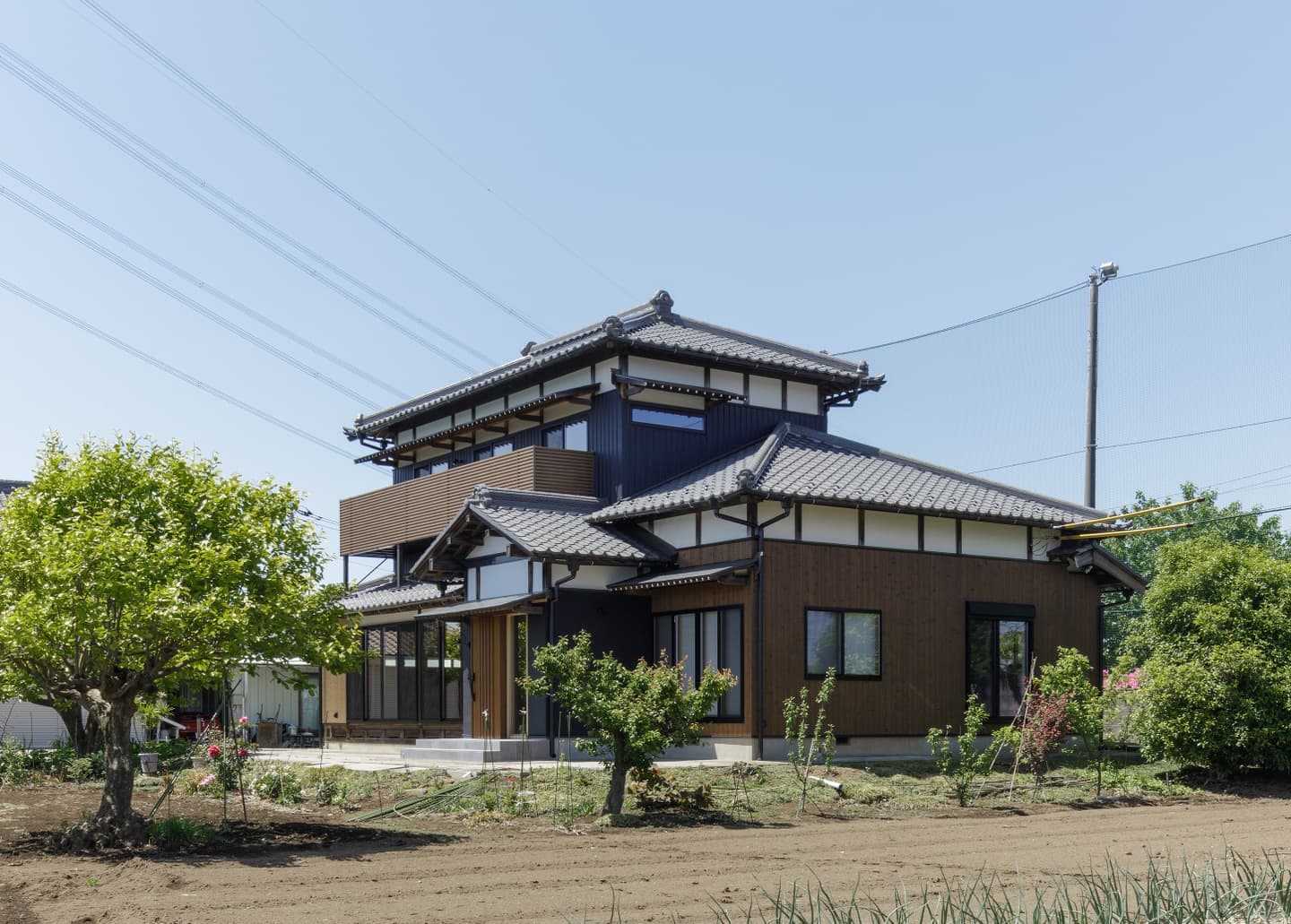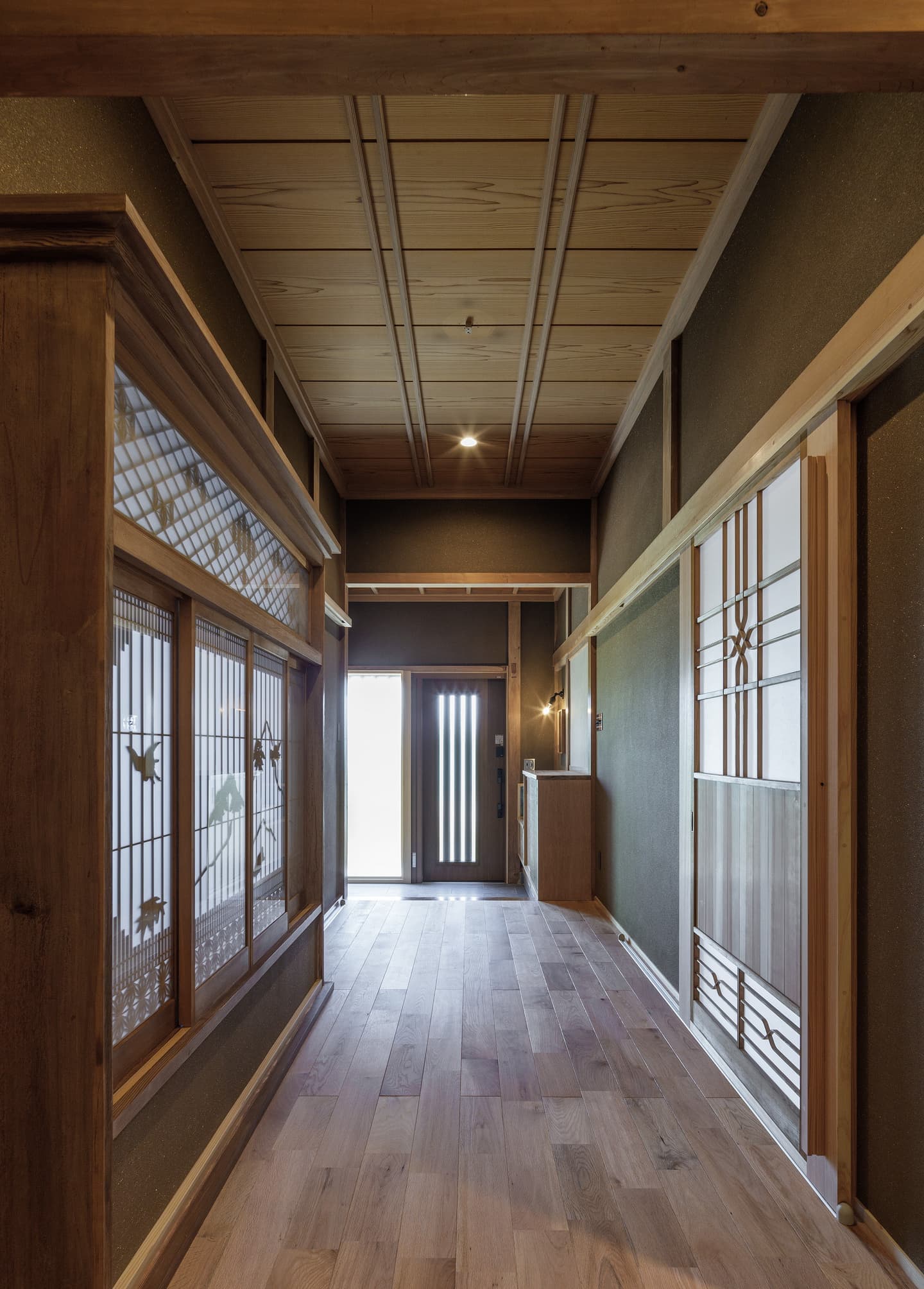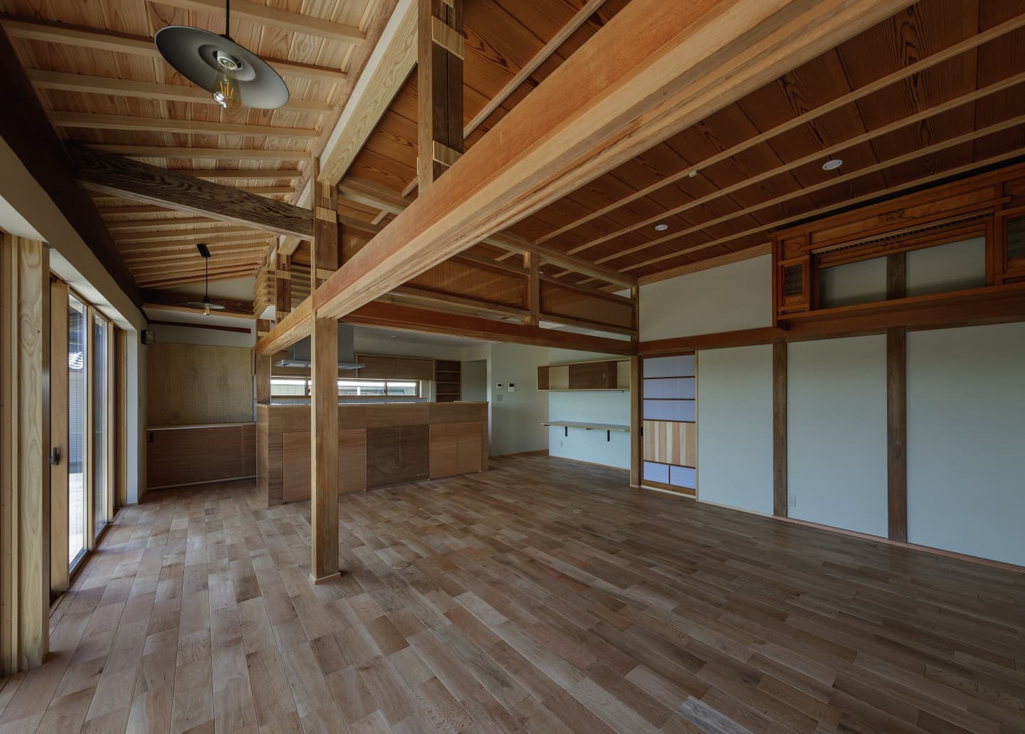 | 築34年、多くの思い出が刻まれた住まいを、フルリノベーションによって新たな暮らしのかたちへと再生しました。 この住まいの象徴である入母屋の瓦屋根を残し、その他の部分はほぼスケルトン状態に。構造の安定を図るため、既存の柱の位置は可能な限りそのまま活かしながら、お施主様のご要望に寄り添った新たな間取りを構築しています。床・壁・天井の断熱強化、構造補強、開口部の断熱性能向上により、快適性も大きく向上しました。 日当たりの良い南側にあった8帖の和室2間続きは、開放的なLDKに再構成。北側にあった和室はキッチンと繋がるバックヤードとし、LDを通らず水回りへアクセスできる裏動線を確保しています。玄関右手のかつての応接室は、来客対応も可能な和室に。奥の台所は、明るく快適な洋室へと生まれ変わりました。 階段は既存のものを再利用し、ルーバーで囲むデザインとすることで空間にやわらかな仕切りを生み出しています。階段を上がった先にあった洋室は、この年代の住宅に多く見られる小屋裏の丸梁をあえて現し、多目的に使用できるホールに。主寝室にはタタミ敷きの小上がりを設け、落ち着いたくつろぎの空間としました。 竿縁天井や襖間、付書院、神棚、建具など、建物が長い年月をかけて纏ってきた風合いある意匠を丁寧に再利用。現代の暮らしに合った設備やインテリアを組み合わせることで、時を超えて愛着をつなぐ、心地よい住まいへと生まれ変わりました。 築34年の沢山の思い出の詰まったお住まいをフルリノベーションしました。 この建物の特徴である入母屋の瓦屋根以外は、ほぼスケルトンの状態にした上で、構造を安定させるため既存の柱の位置は出来るだけ変更せず、その中でお施主様のご要望を盛り込んで部屋をレイアウトし直しています。床と壁と天井の断熱の補強、構造筋交い等の補修補強、窓の性能UPを行い、温熱環境も向上しています。 和室8帖の続き間のあった日当たりの良い南側はLDKに。和室があった北側部分をバックヤードとしてキッチンと繋げ、LDを通らず水回りを経由する裏動線を確保しています。玄関から入って右側の応接室部分を客間としても使える和室へ。その奥の台所部分は洋室に生まれ変わりました。 階段は既存を再利用しルーバーで囲むデザインとし、階段を登り切った部分にあった洋室は、この年代の建物の特徴でもある小屋裏に隈れていた丸梁を天井から露出させ多目的に使えるホールとしています。また主寝室はゆっくりと寛げるタタミ敷きの小上がりとしました。 時間の経過とともに深まった建物の持つ風合いを出来るだけ生かせるデザインを考え、竿縁天井や襴間、付書院や神棚、建貝などを趣のある材料を再利用しながら、現代の暮らしに適した間取りと設備やインテリアとする事で、愛着を残しながらも快適に過ごせるリノベーションとなりました。 |