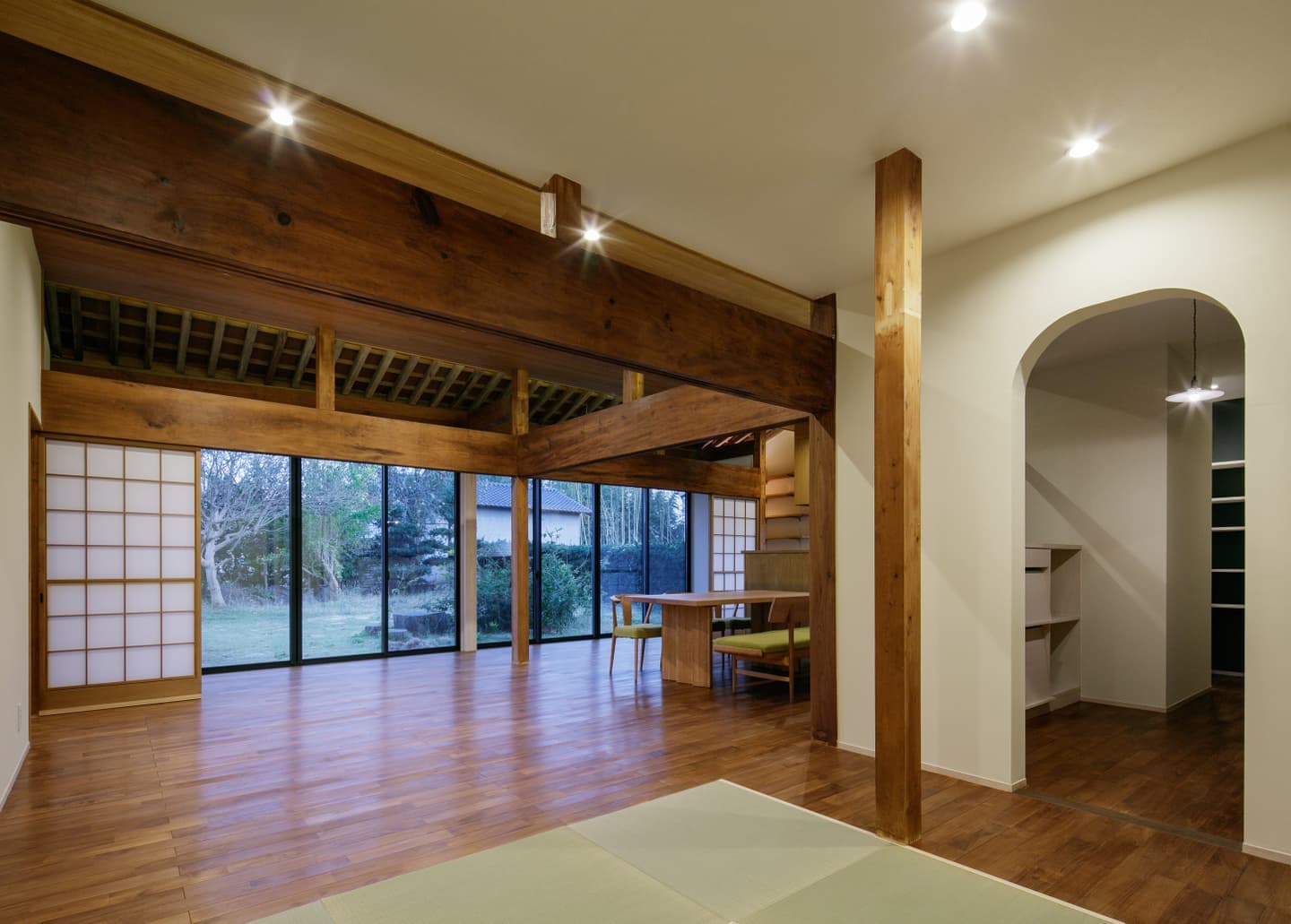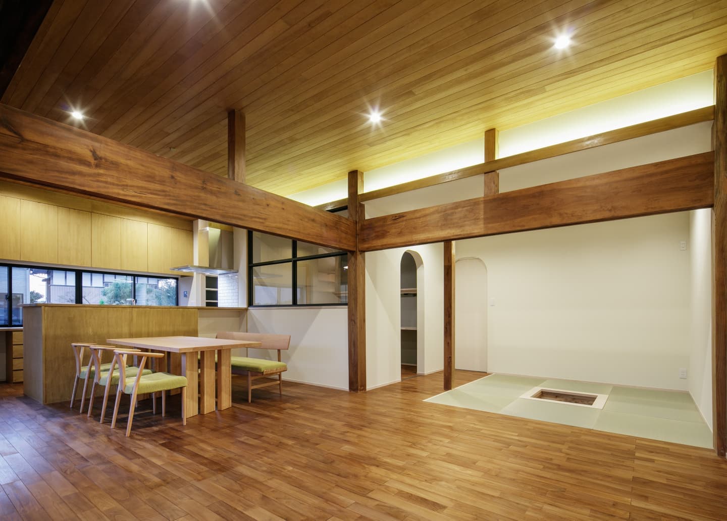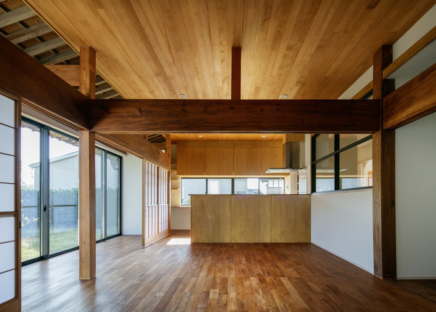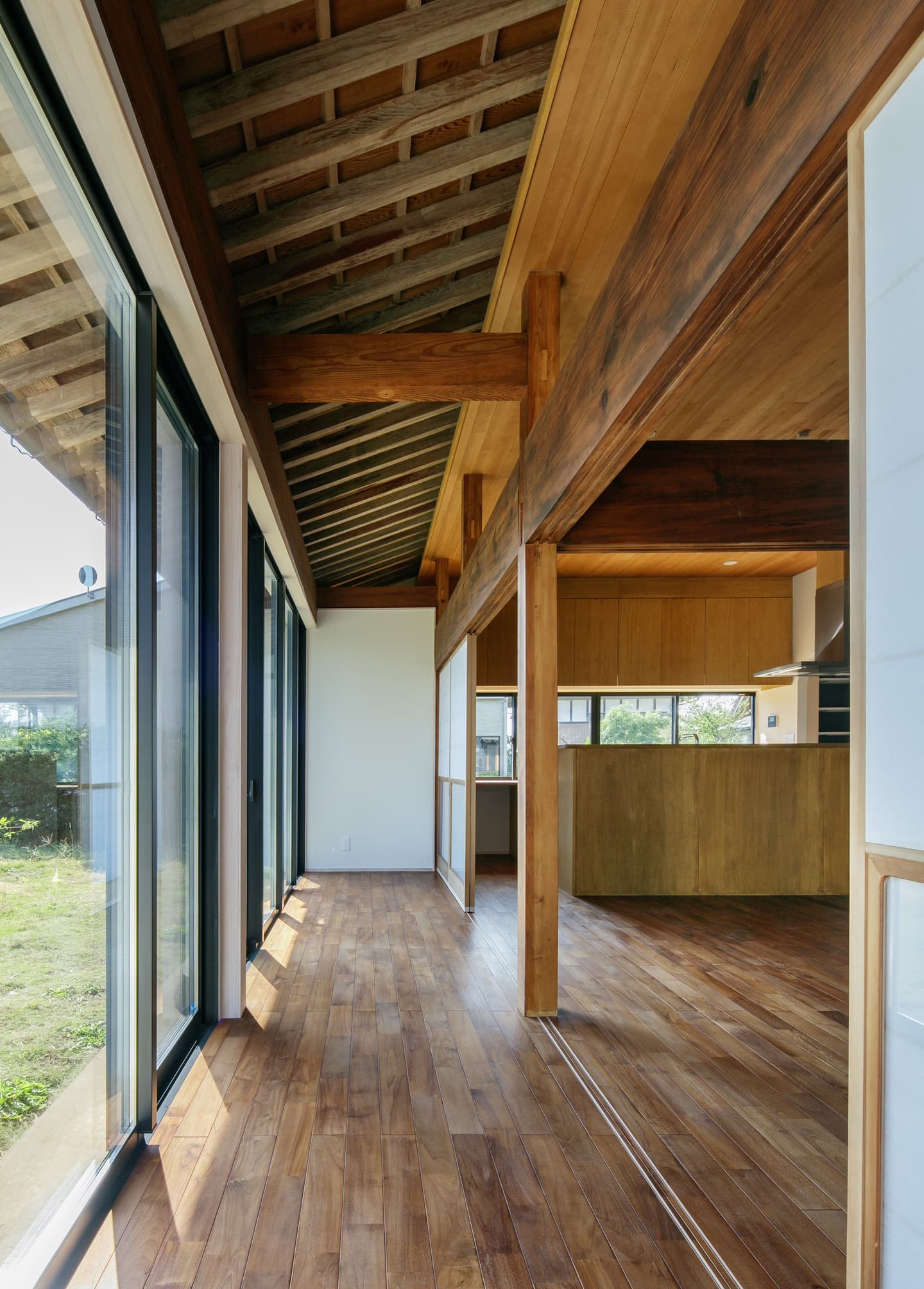 | 築37年の民家をフルリノベーションした計画です。 既存住宅は、入母屋のどっしりとした瓦屋根が特徴で、内部は和室の続き間とそれを取り囲むようにくれ縁がある、つくば郊外に今も残る伝統的な民家スタイルでした。 日当たりの良い続き間を、これからの暮らしの中心となる広々としたLDKへと再構成。2階部分はもとの2室を一体化し、間仕切りや天井を取り払うことで、多目的に使えるゆとりあるホールとしました。 内外装ともに、既存の骨組みや意匠を可能な限り活かしながら、新たな暮らしに寄り添う空間を計画。 古き良き佇まいを残しながら、穏やかで落ち着いた再生を目指しました。 また、耐震診断に基づいて構造補強を実施。制震ダンパーを導入し、現行基準に適合する耐震性を確保しています。 |