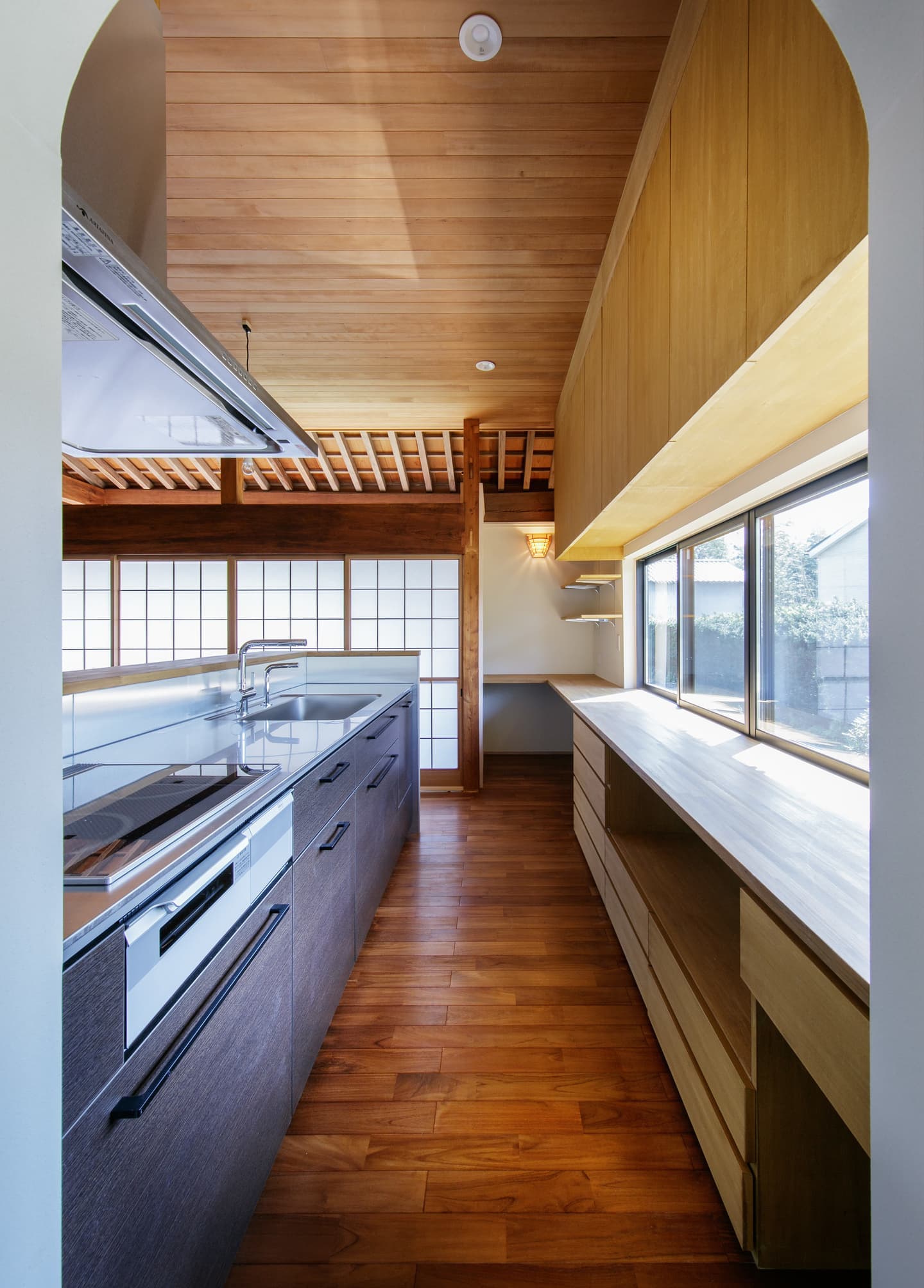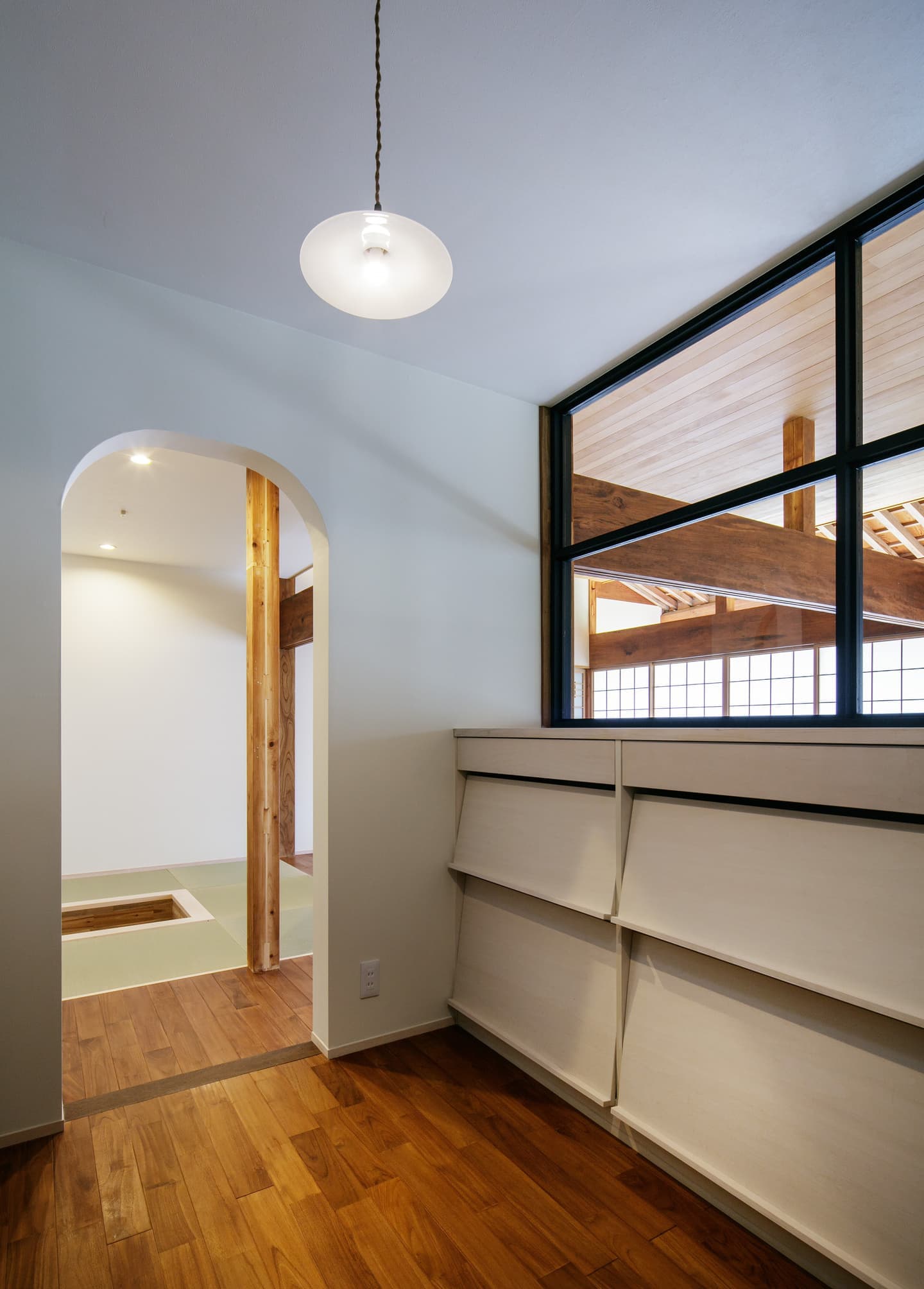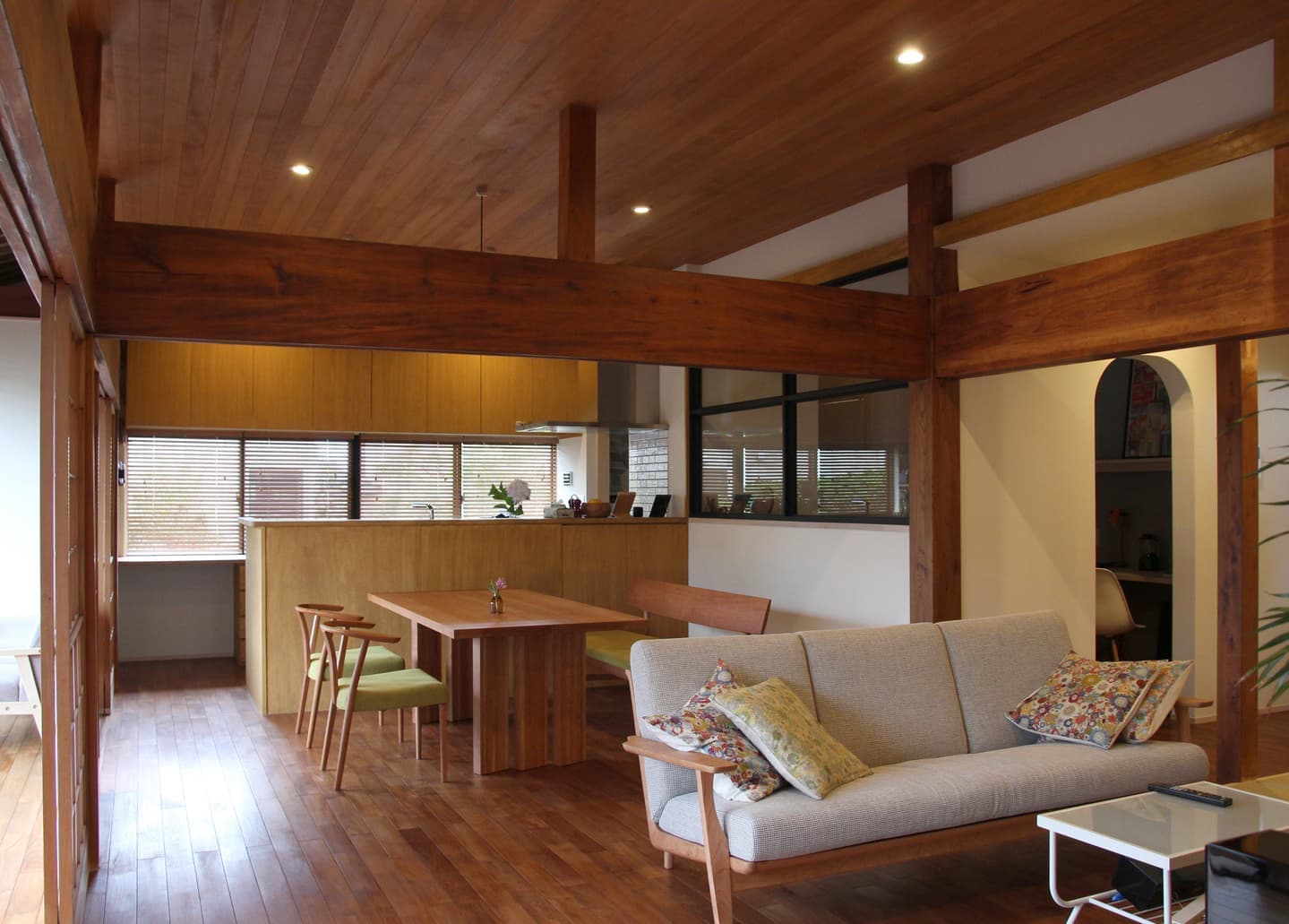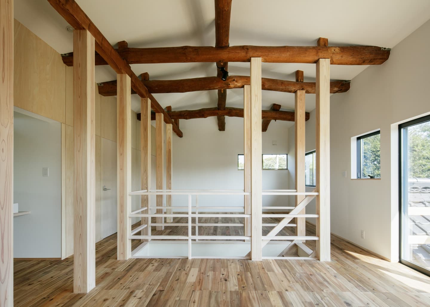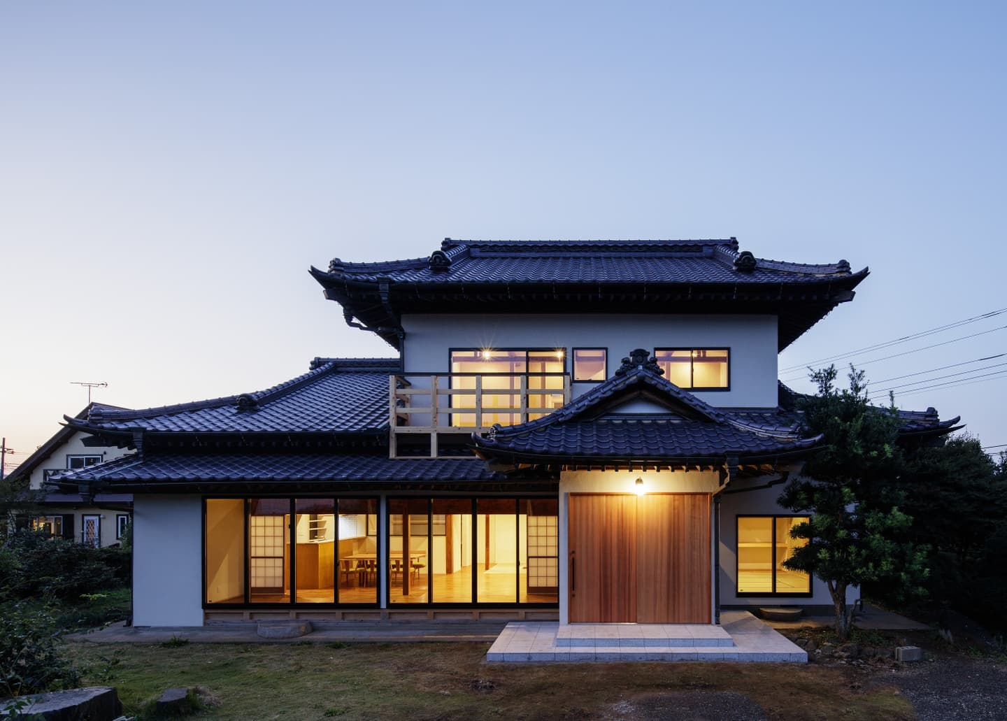 | 築37年の民家をフルリノベーションした計画です。 既存住宅は、入母屋のどっしりとした瓦屋根が特徴で、内部は和室の続き間とそれを取り囲むようにくれ縁がある、つくば郊外に今も残る伝統的な民家スタイルでした。 日当たりの良い続き間を、これからの暮らしの中心となる広々としたLDKへと再構成。2階部分はもとの2室を一体化し、間仕切りや天井を取り払うことで、多目的に使えるゆとりあるホールとしました。 内外装ともに、既存の骨組みや意匠を可能な限り活かしながら、新たな暮らしに寄り添う空間を計画。 古き良き佇まいを残しながら、穏やかで落ち着いた再生を目指しました。 また、耐震診断に基づいて構造補強を実施。制震ダンパーを導入し、現行基準に適合する耐震性を確保しています。 |