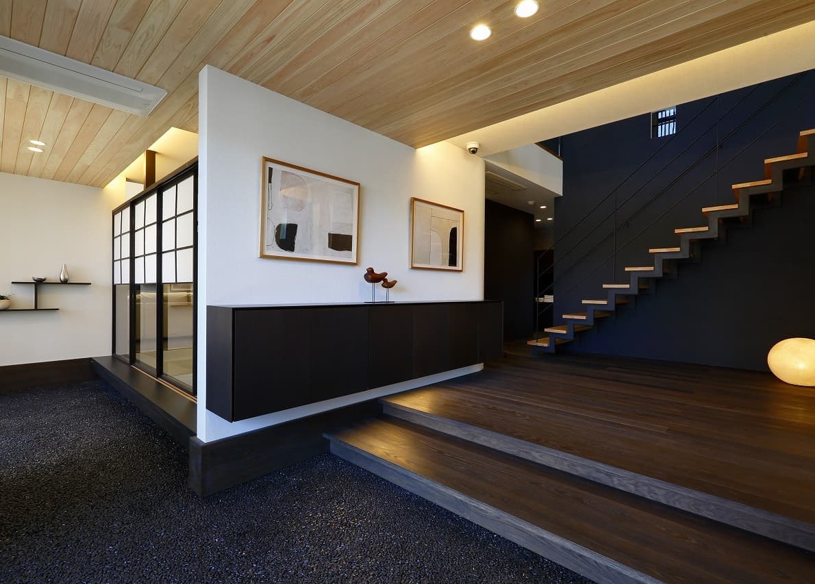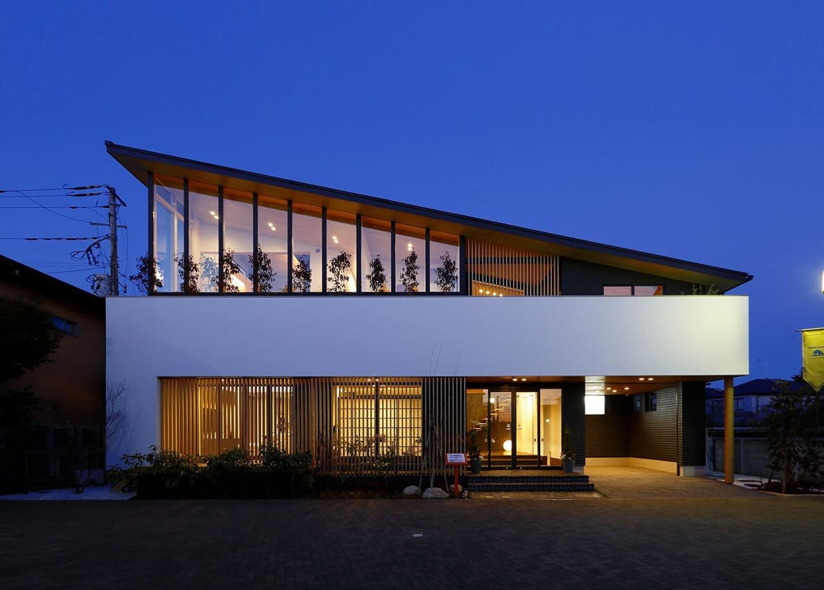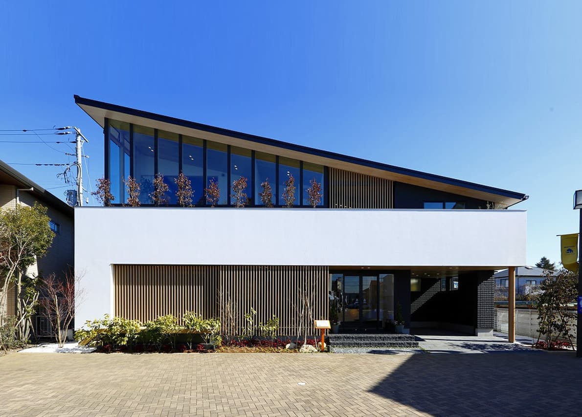 | 株式会社アキュラホーム 守谷展示場 本計画は、2017年の設計コンペにて採用され、設計監修を行いました。 外観は、片流れのシャープな屋根と縦格子の木目調ルーバーが印象的な構成。2階より上部をガラスウォールとすることで、屋根が軽やかに浮かび上がるようなデザインとしています。1階のルーバーは可動式となっており、時間帯や季節に応じて視線や日射を柔軟に調整できるよう配慮しています。 内部は、外観のモダンな印象とは対照的に、日本の伝統文化を意識した和の要素を随所に取り入れた、落ち着きのある空間構成としています。素材選びや細部の設えにこだわりながら、アキュラホームの技術力を活かし、現代的な感性を添えた遊び心のある空間となっています。 各室は実生活を想定したスケール感で構成されており、日々の暮らしの中で心地よさを実感できるよう、丁寧なプランニングを行いました。 |