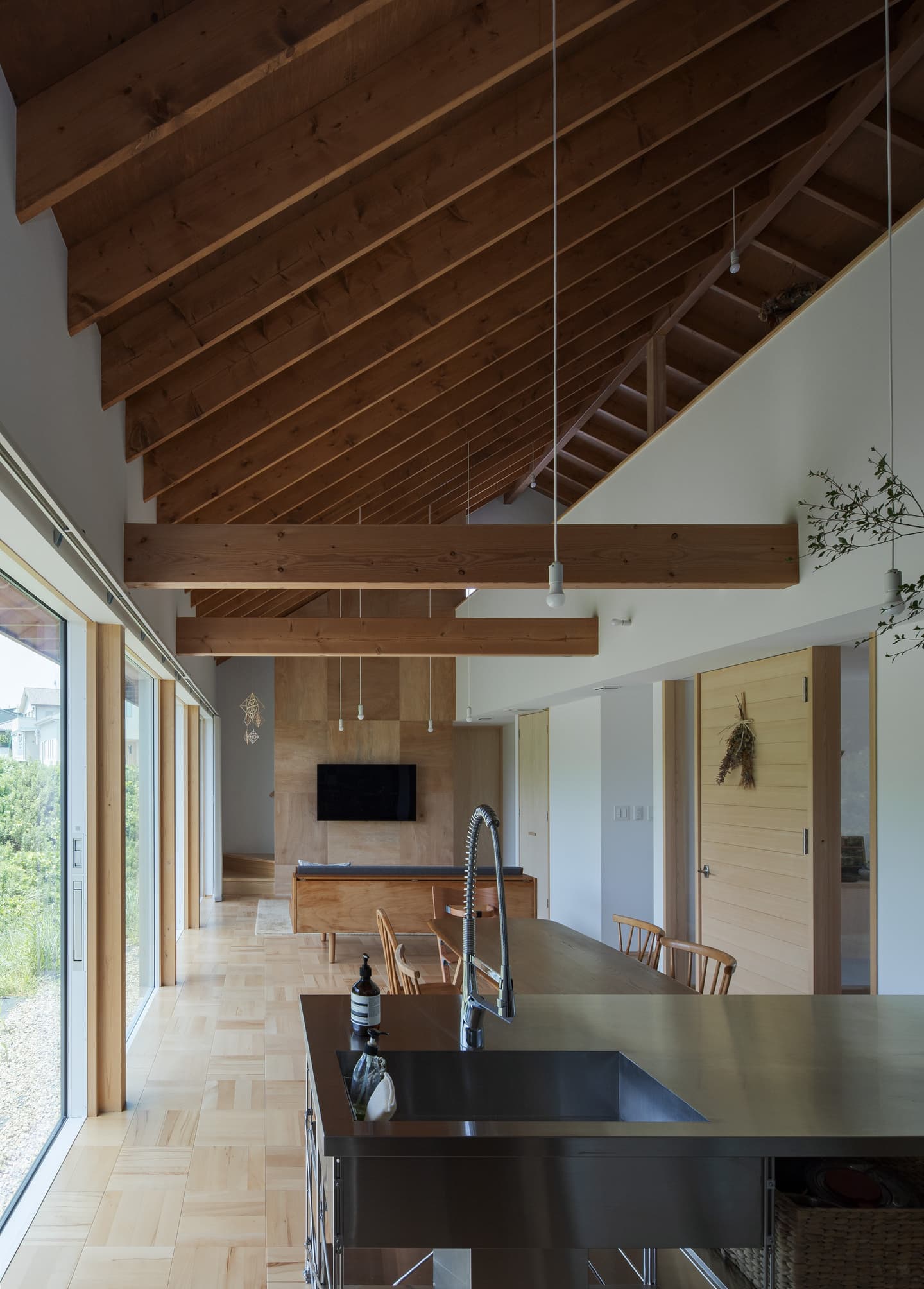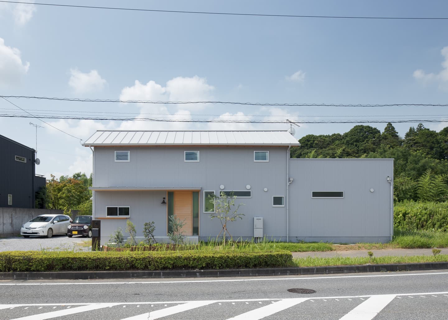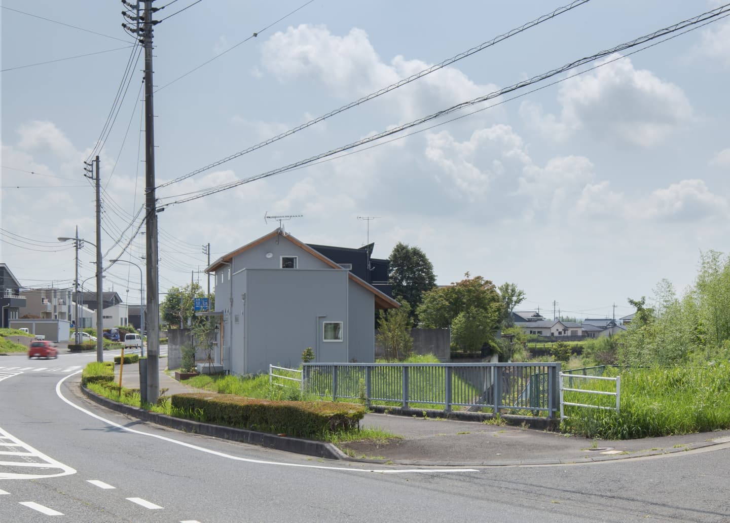 | 龍ヶ崎市、川沿いの法面を含む特徴的な敷地に建つ住まい。 ニュータウン内にありながら、区画整理の端部に位置することで南側には開発を免れた雑木林が残され、自然環境に恵まれた希少なロケーションです。敷地は台形状で、川に向かって大きく傾斜する法面を含んでおり、平坦な部分だけでは建物の配置に工夫を要する形状でした。そのため長らく未活用のままとなっていましたが、「家に居ながら自然を感じたい」という施主の想いに、この場所はまさに応えるものでした。 建物は、プライバシーと開放性の対比を軸に構成。玄関のある北側は道路に面し、交通量が多いため開口部を抑えた閉じた表情とし、南側の川と雑木林に向けては、大開口を設けて風景と光を取り込みました。特にLDKには連続した大きな窓を配置し、室内に居ながら季節の移ろいを感じられる空間としています。 1階にはLDKのほか、主寝室と水回りを配置。2階は子供部屋とし、勾配天井に現しで設けた垂木が整然と並ぶ吹抜けが上下階をゆるやかに繋ぎ、住まい全体に一体感と豊かな広がりをもたらしています。 |
