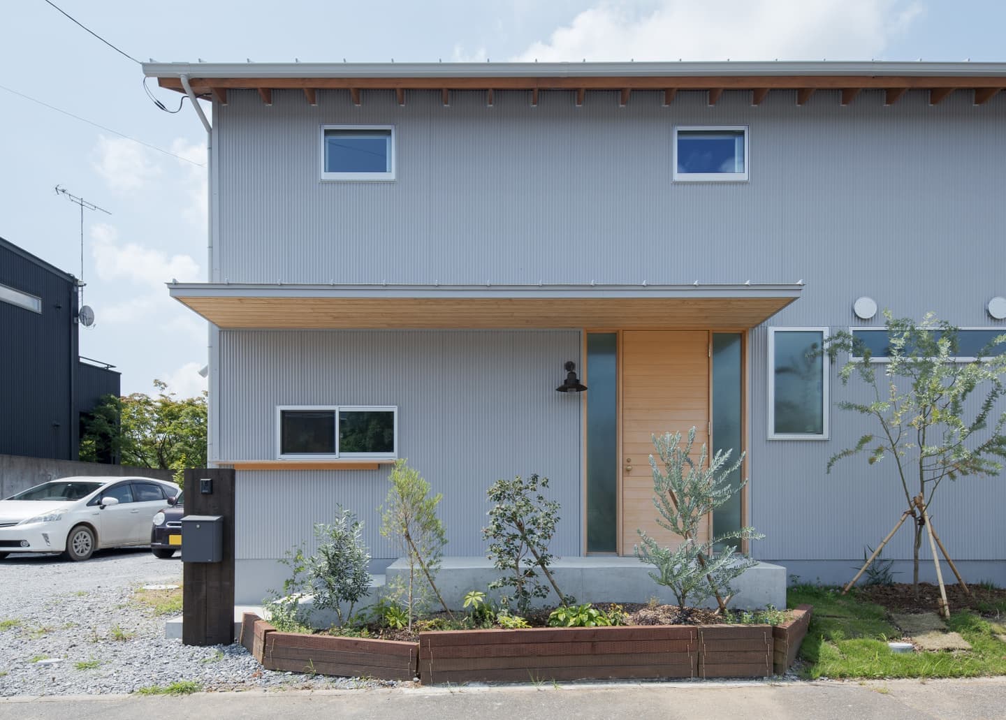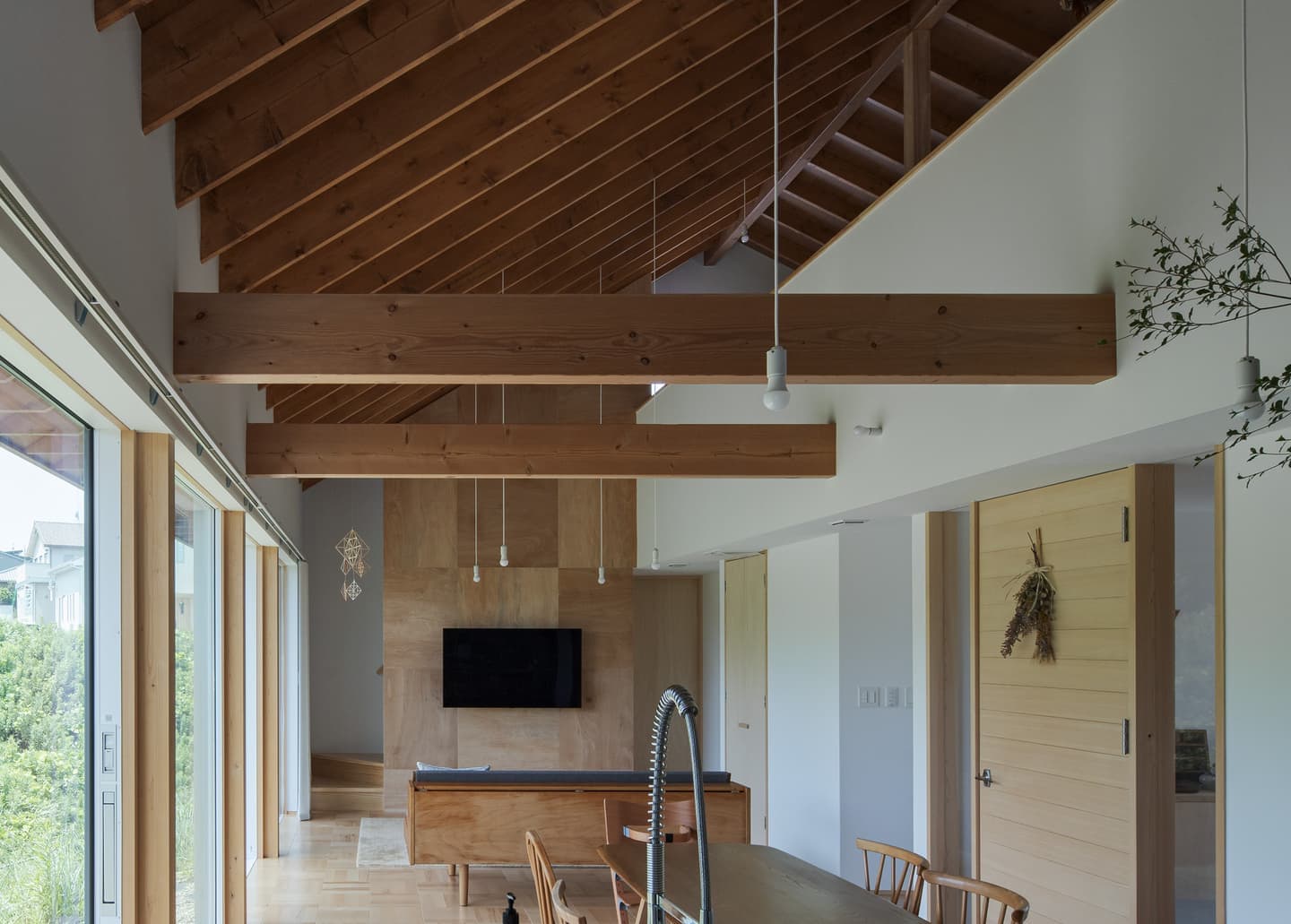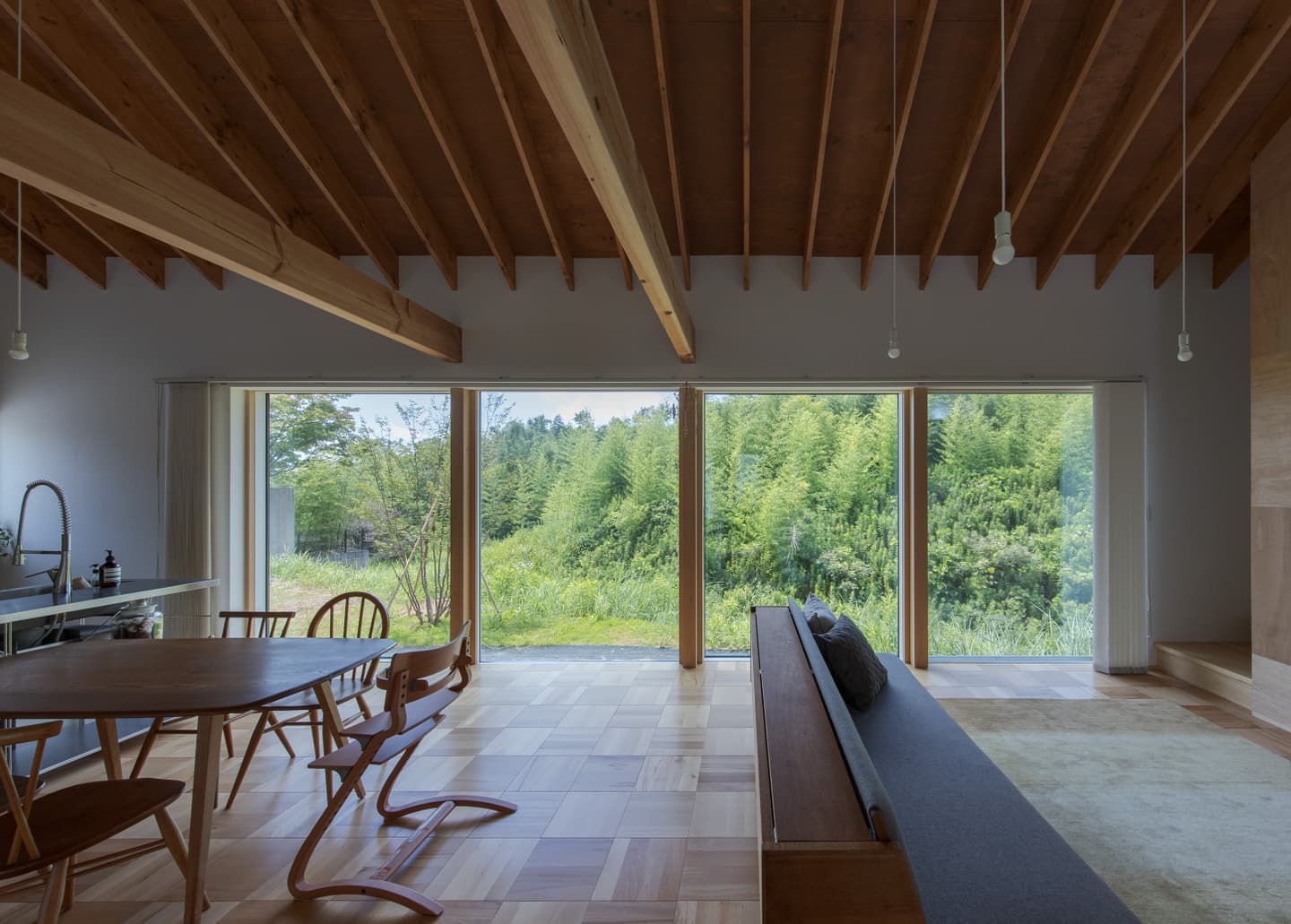 | 龍ヶ崎市、川沿いの法面を含む特徴的な敷地に建つ住まい。 ニュータウン内にありながら、区画整理の端部に位置することで南側には開発を免れた雑木林が残され、自然環境に恵まれた希少なロケーションです。敷地は台形状で、川に向かって大きく傾斜する法面を含んでおり、平坦な部分だけでは建物の配置に工夫を要する形状でした。そのため長らく未活用のままとなっていましたが、「家に居ながら自然を感じたい」という施主の想いに、この場所はまさに応えるものでした。 建物は、プライバシーと開放性の対比を軸に構成。玄関のある北側は道路に面し、交通量が多いため開口部を抑えた閉じた表情とし、南側の川と雑木林に向けては、大開口を設けて風景と光を取り込みました。特にLDKには連続した大きな窓を配置し、室内に居ながら季節の移ろいを感じられる空間としています。 1階にはLDKのほか、主寝室と水回りを配置。2階は子供部屋とし、勾配天井に現しで設けた垂木が整然と並ぶ吹抜けが上下階をゆるやかに繋ぎ、住まい全体に一体感と豊かな広がりをもたらしています。 |