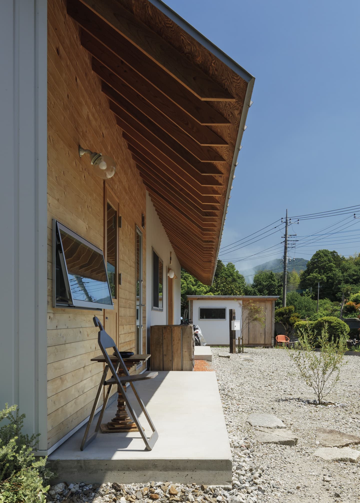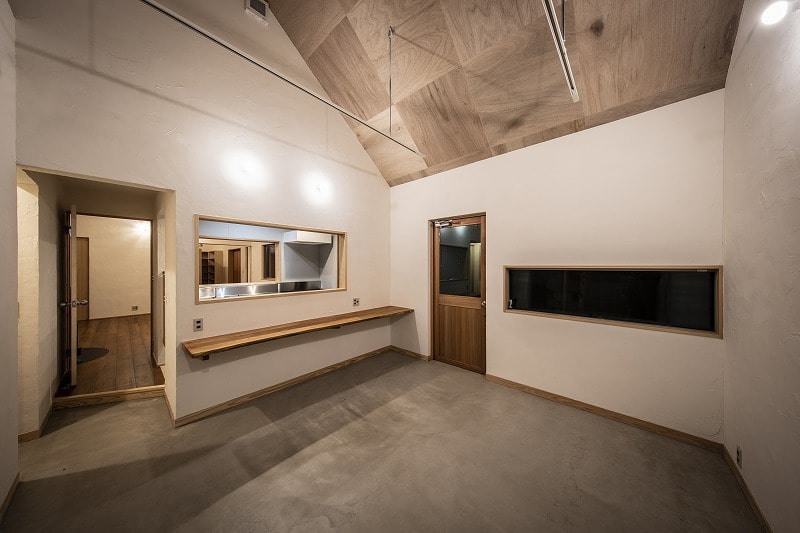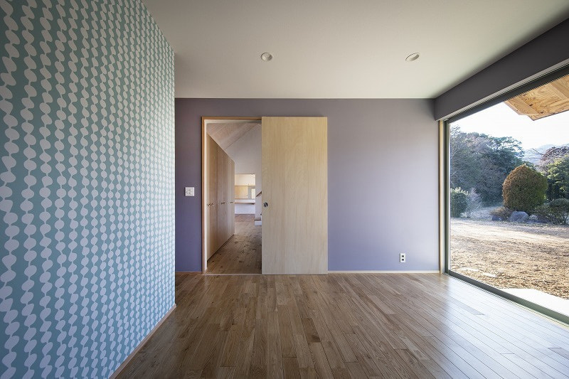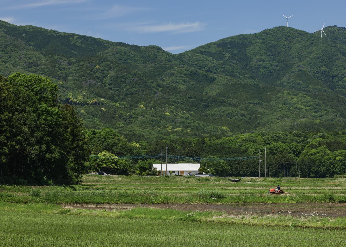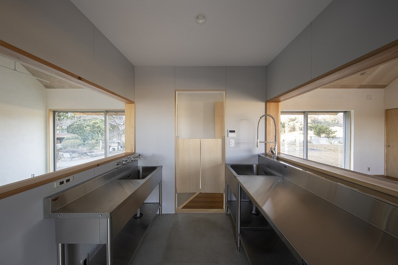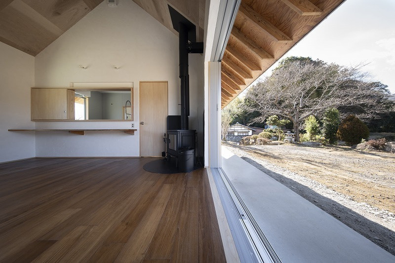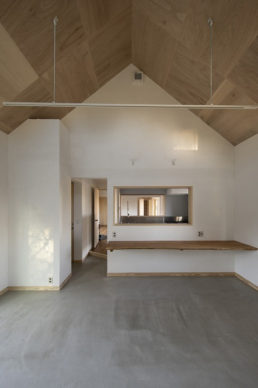 | 石岡市(旧八郷町)、加波山や足尾山を望む田園地帯に建つ住宅。 敷地は筑波連山の麓に広がるのどかな里山風景の中にあり、周囲では季節のフルーツ狩りが楽しめるほか、スカイスポーツも盛んな地域。敷地上空には、時折パラグライダーが風に乗って舞う姿が見られる、開放感あふれるロケーションです。 この豊かな自然環境を最大限に享受するため、「すべての部屋から山並みを眺めたい」という建主の明確な要望が設計の出発点となりました。 建物は奥行き4,550mm、間口19,565mmの横長の平面構成。各室が風景に向かって整列するように配置されており、部屋ごとに異なる角度での景色を楽しむことができます。屋根は8寸勾配の切妻とし、軒を1,365mm張り出すことで、水平線を強調。ハゼの整列と直線的な軒先が建物のプロポーションを整え、間口の広いファサードに統一感をもたらしています。大きな勾配は内部にゆとりある天井高を生み出し、一部は小屋裏収納としても活用可能です。 将来的な店舗利用を見据えたプランニングも特徴で、LDと店舗の中間にキッチンを配置し、両空間から利用できるよう設計。LDKは玄関ホールを介して水回りや主寝室、2階の洋室へとスムーズに繋がる回遊性ある構成となっています。 主要道路に面した南側は開口部を最小限に抑えつつ、北側には里山の景色が広がることから、浴室を含め外に大きく開いた設計としました。LDKにはフルオープンのワイドサッシを採用し、内に居ながら外の風景と一体となれる開放的な空間が広がります。 建主がよく知るこの土地の魅力や風景へのまなざしを丁寧にすくい取り、環境と呼応する住まいとしてかたちにしました。 敷地は石岡市(旧八郷町)。筑波連山の一部である加波山や足尾山の麓に位置し長閑な田園風景に囲まれています。周辺では様々なフルーツ狩りを楽しめるほか、スカイスポーツも盛んな地域であり、敷地からは里山を吹き抜ける心地よい風に舞うパラグライダー等の姿を見る事ができます。 これらの好立地をできるだけ建物の中からも楽しめるように、すべての部屋から山々の風景を眺められる事がお客様からのご要望でした。 建物は奥行き4,550mmで間口が19,565mm。配置は見たい風景に向かった角度として部屋を横に並べる事で窓からの景色の条件を合わせています。 屋根は切妻の8/10勾配で軒は1,365mm出しています。整列して並ぶハゼや直線の軒先で屋根面を強調し、間口の広い建物のファサードバランスをとるように考えました。屋根の勾配を大きくする事で、部屋の天井高を確保しており、一部は小屋裏収納としても使えるようになっています。 部屋の構成ですが、将来一部を店舗として使う計画がある為、LDと店舗の間にキッチンを挟むように配置し、キッチンは両方の部屋から使えるように計画しています。LDKからは玄関ホールを経由して水回りと2階洋室、主寝室と繋がっています。 南側は主要道路に面する事から開口部を最小限にしていますが、良好な景色が見える北側は浴室も含め外に開いた計画としており、LDKはフルオープンのワイドサッシで部屋に居ながら外の風景を楽しめるようになっています。 敷地の特徴を一番に知っているお客様のご要望を建物に取り入れる事で、周辺の環境を素直に受け入れる事ができ、その場に馴染む建築となりました。 |