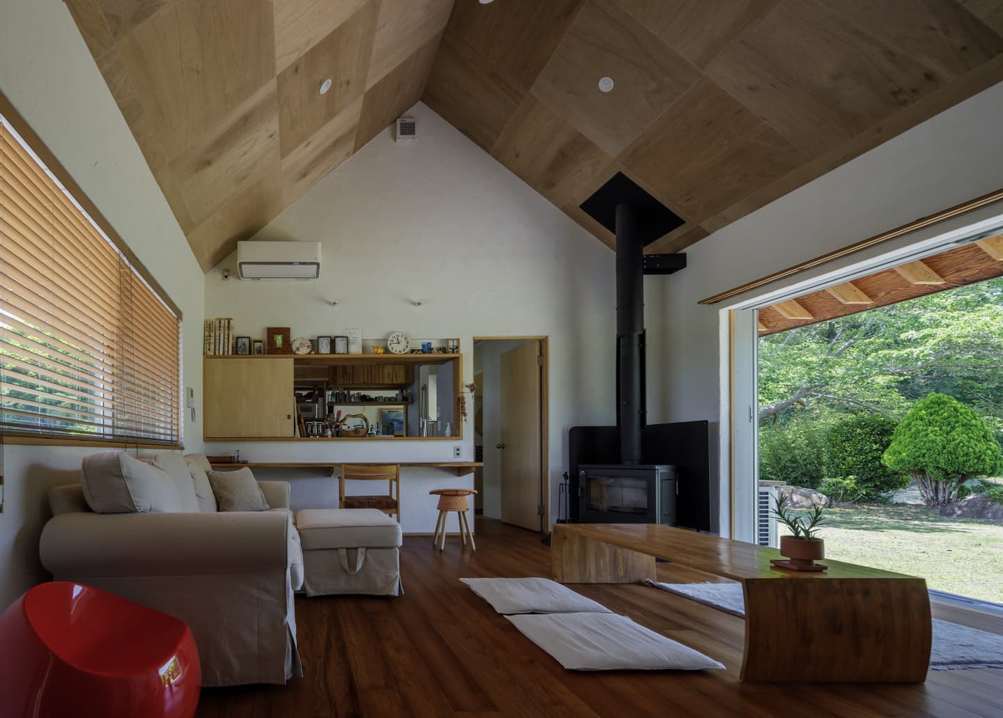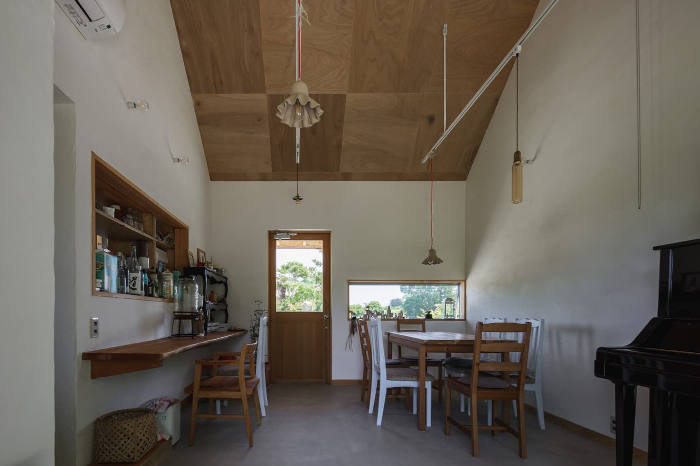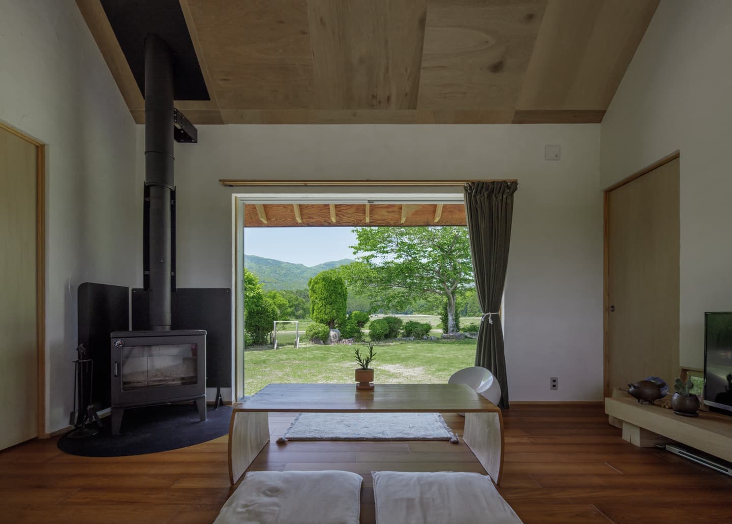 | 石岡市(旧八郷町)、加波山や足尾山を望む田園地帯に建つ住宅。 敷地は筑波連山の麓に広がるのどかな里山風景の中にあり、周囲では季節のフルーツ狩りが楽しめるほか、スカイスポーツも盛んな地域。敷地上空には、時折パラグライダーが風に乗って舞う姿が見られる、開放感あふれるロケーションです。 この豊かな自然環境を最大限に享受するため、「すべての部屋から山並みを眺めたい」という建主の明確な要望が設計の出発点となりました。 建物は奥行き4,550mm、間口19,565mmの横長の平面構成。各室が風景に向かって整列するように配置されており、部屋ごとに異なる角度での景色を楽しむことができます。屋根は8寸勾配の切妻とし、軒を1,365mm張り出すことで、水平線を強調。ハゼの整列と直線的な軒先が建物のプロポーションを整え、間口の広いファサードに統一感をもたらしています。大きな勾配は内部にゆとりある天井高を生み出し、一部は小屋裏収納としても活用可能です。 将来的な店舗利用を見据えたプランニングも特徴で、LDと店舗の中間にキッチンを配置し、両空間から利用できるよう設計。LDKは玄関ホールを介して水回りや主寝室、2階の洋室へとスムーズに繋がる回遊性ある構成となっています。 主要道路に面した南側は開口部を最小限に抑えつつ、北側には里山の景色が広がることから、浴室を含め外に大きく開いた設計としました。LDKにはフルオープンのワイドサッシを採用し、内に居ながら外の風景と一体となれる開放的な空間が広がります。 建主がよく知るこの土地の魅力や風景へのまなざしを丁寧にすくい取り、環境と呼応する住まいとしてかたちにしました。 敷地は石岡市(旧八郷町)。筑波連山の一部である加波山や足尾山の麓に位置し長閑な田園風景に囲まれています。周辺では様々なフルーツ狩りを楽しめるほか、スカイスポーツも盛んな地域であり、敷地からは里山を吹き抜ける心地よい風に舞うパラグライダー等の姿を見る事ができます。 これらの好立地をできるだけ建物の中からも楽しめるように、すべての部屋から山々の風景を眺められる事がお客様からのご要望でした。 建物は奥行き4,550mmで間口が19,565mm。配置は見たい風景に向かった角度として部屋を横に並べる事で窓からの景色の条件を合わせています。 屋根は切妻の8/10勾配で軒は1,365mm出しています。整列して並ぶハゼや直線の軒先で屋根面を強調し、間口の広い建物のファサードバランスをとるように考えました。屋根の勾配を大きくする事で、部屋の天井高を確保しており、一部は小屋裏収納としても使えるようになっています。 部屋の構成ですが、将来一部を店舗として使う計画がある為、LDと店舗の間にキッチンを挟むように配置し、キッチンは両方の部屋から使えるように計画しています。LDKからは玄関ホールを経由して水回りと2階洋室、主寝室と繋がっています。 南側は主要道路に面する事から開口部を最小限にしていますが、良好な景色が見える北側は浴室も含め外に開いた計画としており、LDKはフルオープンのワイドサッシで部屋に居ながら外の風景を楽しめるようになっています。 敷地の特徴を一番に知っているお客様のご要望を建物に取り入れる事で、周辺の環境を素直に受け入れる事ができ、その場に馴染む建築となりました。 |