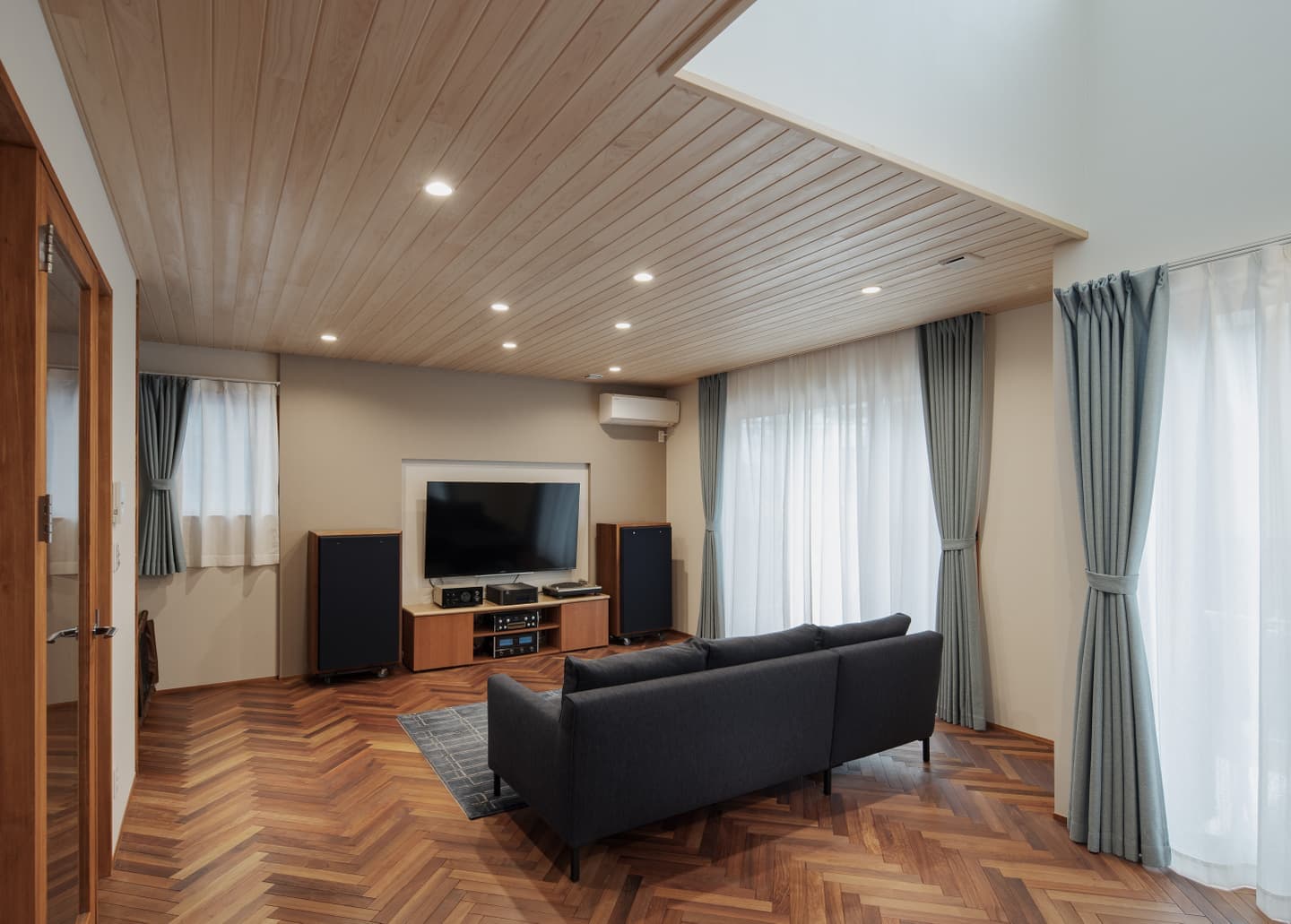 | 外壁) ガルバリウム鋼板竪波 内装) 壁) クロス 天井)ヒノキ羽目板・クロス 床) 無垢フローリング |