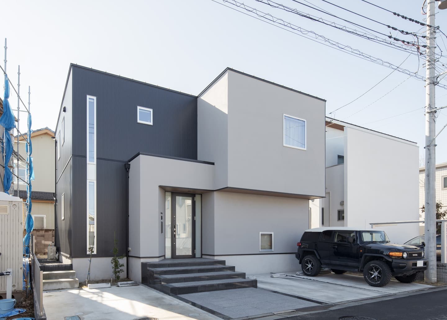 | つくば市内の新興住宅地に計画された、北側接道の敷地に建つ住宅。 外観は、モノトーンのボリュームを組み合わせた構成とし、街並みに対して静かな存在感を放つ造形としています。 内装は、カリン材のヘリンボーン張りが美しい広々としたLDKを中心に構成され、家族の生活の核となる場を形成。吹抜けを介して2階の個室と緩やかに繋がり、空間全体に一体感をもたらしています。 LDKに連続するタタミコーナーは、子どもの遊び場や来客時の多目的な空間として柔軟に対応。 階段には鉄骨と縞鋼板を用い、空間に素材感と力強さを加えるアクセントとしています。 |